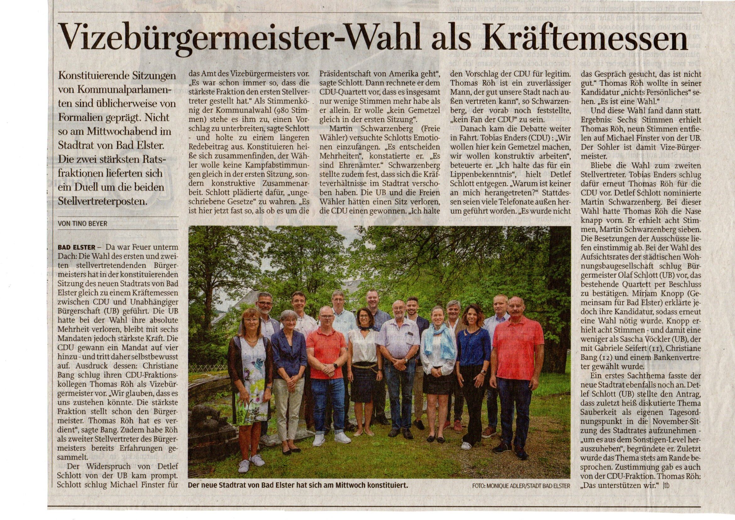 Am Samstag, dem 10.08.24 berichtet die FP in ihrer Wochenendausgabe über die Konstituierung des neuen Stadtrates. Wir stellen den Pressebericht hier zum Nachlesen auf unserer HP ein.