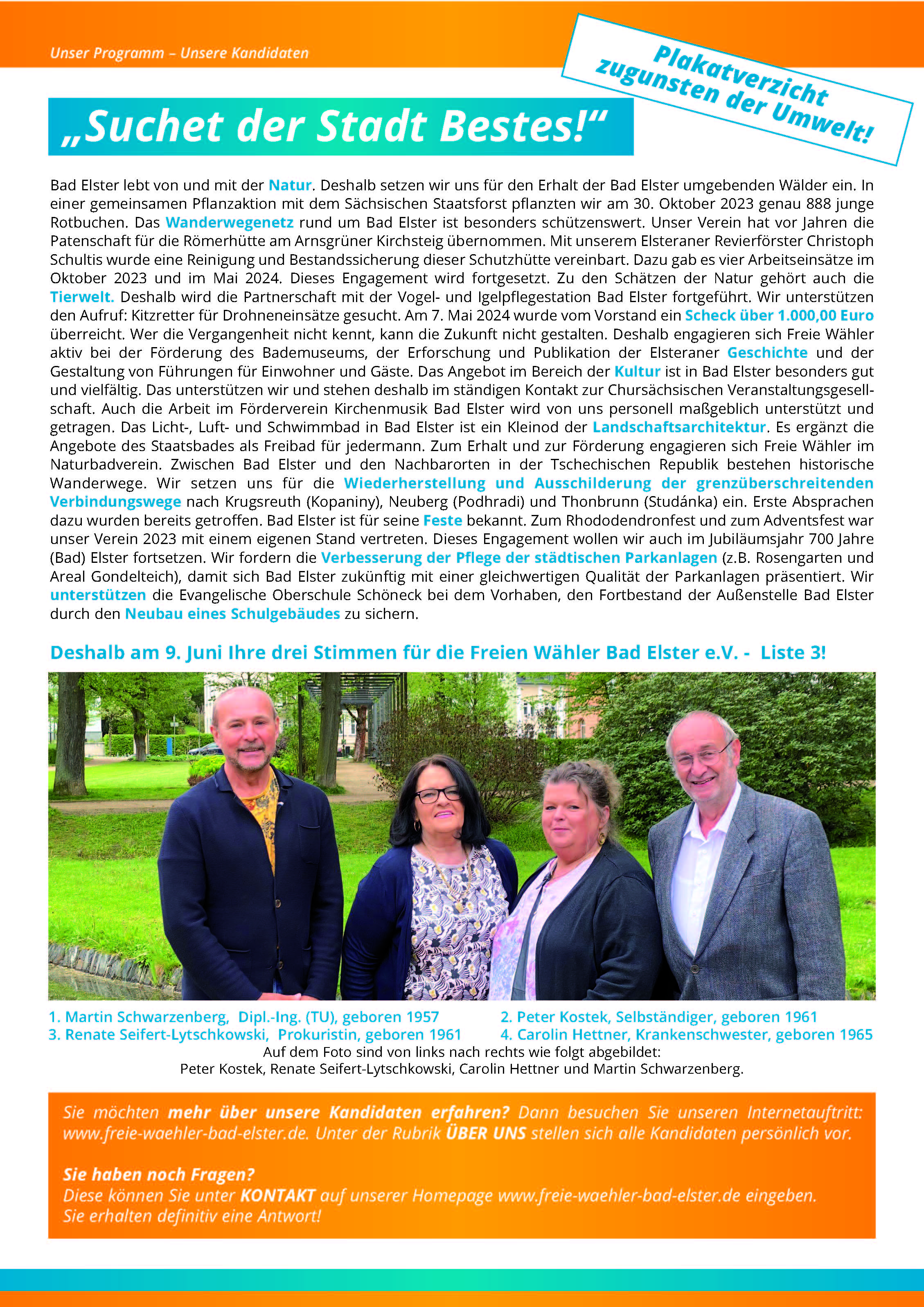 Heute in zwei Wochen ist die Stadtratswahl vorbei. Bitte nutzen Sie Ihr Wahlrecht! Nebenstehend finden Sie die Wahlinformation der Freien Wähler Bad Elster. Durch Anklicken kann man das Bild vergrößern. Seit heute wird der Elsteraner Stadtanzeiger Nr. 133 an alle Haushalte der Stadt Bad Elster verteilt. Allerdings werden nur Briefkästen versorgt, die keinen Aufkleber "keine Werbung" tragen. Wenn Sie unsere Zeitung vermissen, können Sie auf dieser Homepage unter der Rubrik ELSTERANER STADTANZEIGER die Nr. 133 aufrufen und das PDF-Dokument herunterladen.